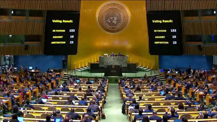 168个国度投了赞美票。中国、好意思国、英国、法国、德国、日本,全在赞美名单里。四个投反对票的国度:俄罗斯、白俄罗斯、朝鲜、尼加拉瓜。