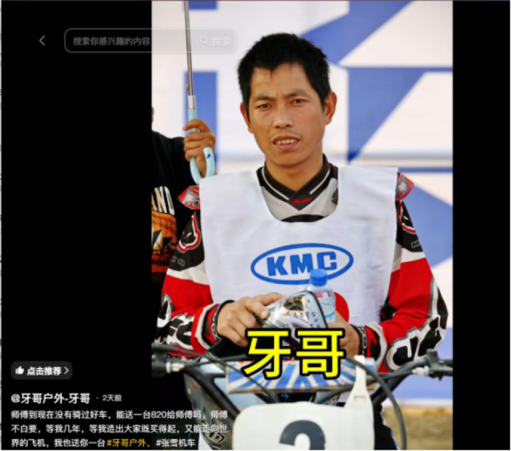 牙哥原名张继星,据荔枝新闻报说念,他曾14次获取寰球越野摩托锦标赛冠军,是国内较早一批工作摩托车赛车手。2007年,他在江苏比赛时间,遭受了一心念念进车队的张雪。彼时,20岁的张雪因年岁偏大、蹊径野,正在各个车队碰壁。