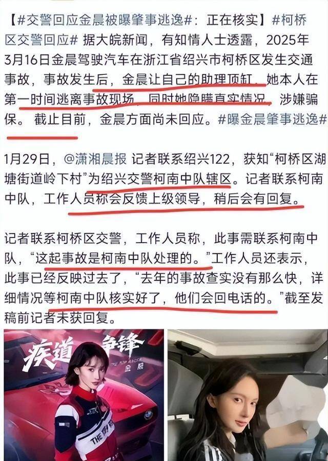 内容说的是:2025年3月16日,金晨在浙江省绍兴市柯桥区驾车出行,发生了一王人单车交通事故。