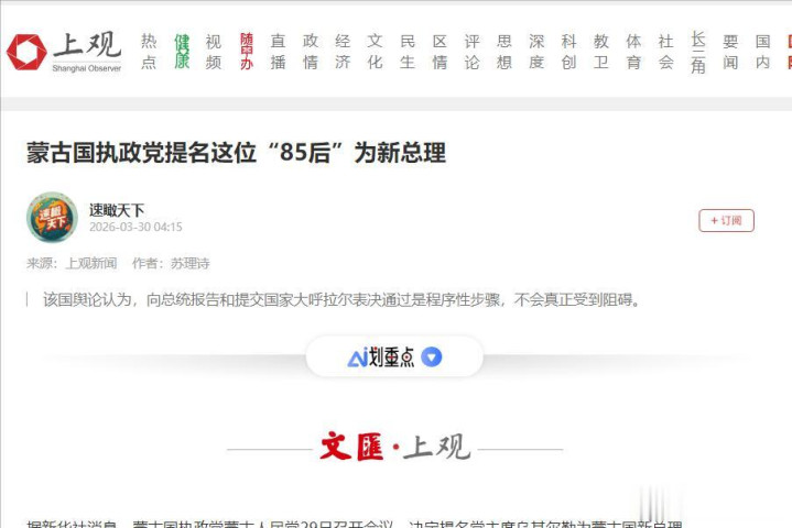 2026年3月末,邻国蒙古政坛突发颤动,3月27日晚,国度高歌拉尔以74%的高票通过批准。